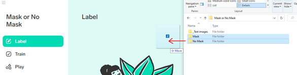 In this scenario, you collected 60 images of people, 30 with masks and 30 without. You created two separate folders labeled "Mask" and "No Mask" and then simply dragged and dropped the images into Lobe. It did the rest - automatically labeling each image and beginning the training process.