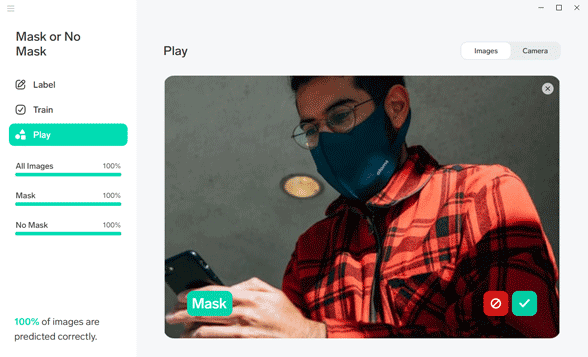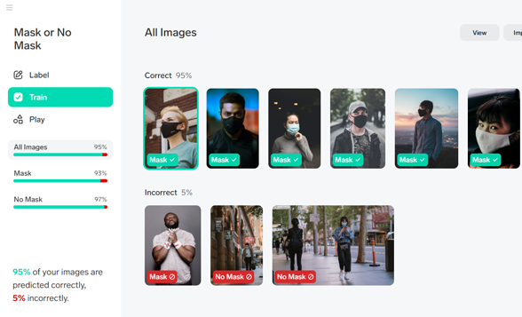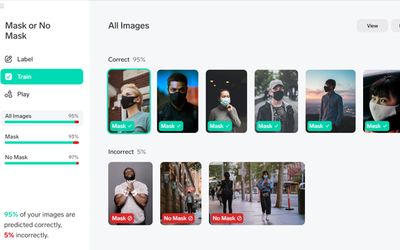 Of course, no machine learning model is perfect, and there may be instances where some images require a bit of help. For example, you may come across an image of a man without a mask but with his hands covering his face. In such cases, all you have to do is either fix the label or delete the image, and Lobe will adjust the model accordingly.