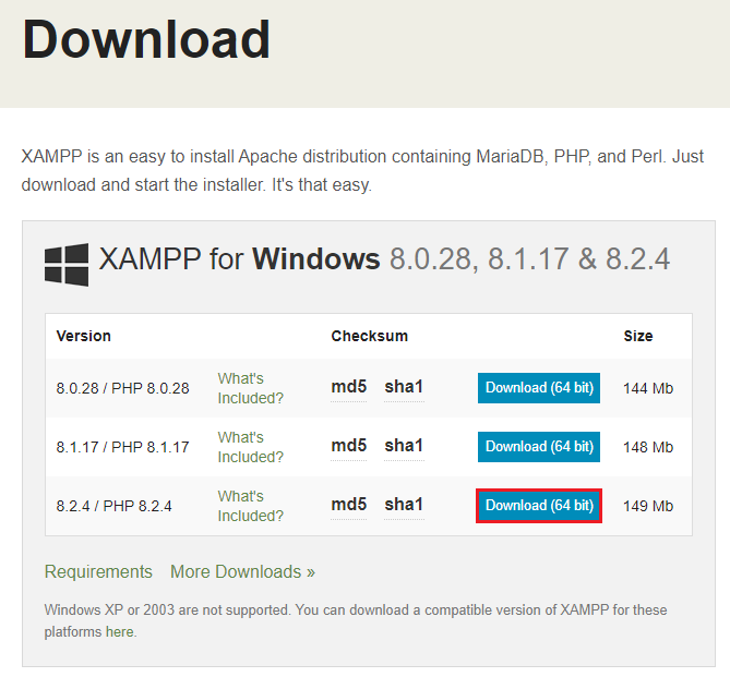 Just go to the XAMPP website and look for the downloads section. Choose the version that matches your operating system. Click on the download button, and the XAMPP setup file will start downloading.
