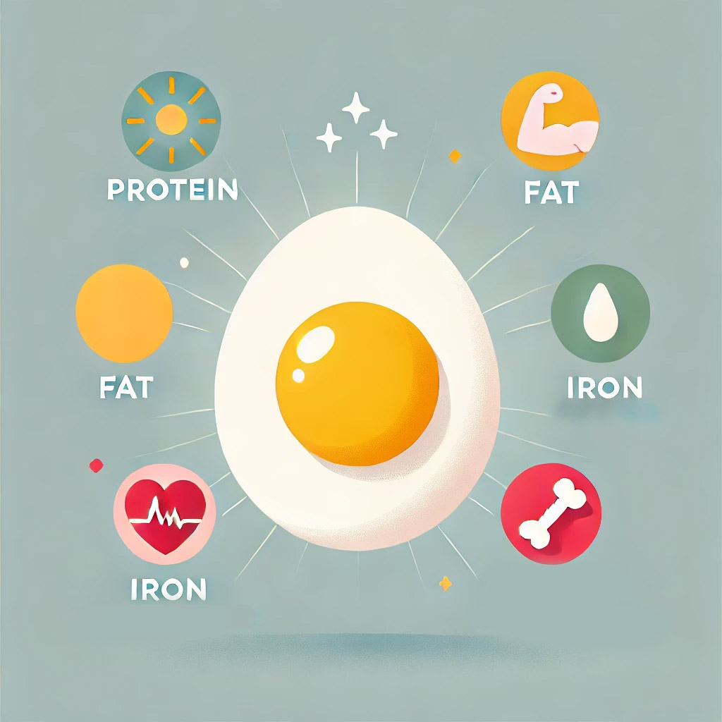 ⁵ בֵּיצִים מְכִילוֹת גַּם מִינֵרָלִים כְּמוֹ בַּרְזֶל, שֶׁחָשׁוּב לְהוֹבָלַת חַמְצָן בַּדָּם, וְסִידָן, שֶׁחָשׁוּב לִבְרִיאוּת הָעֲצָמוֹת וְהַשִּׁנַּיִם.