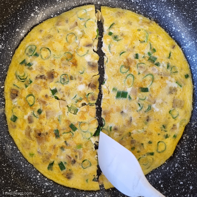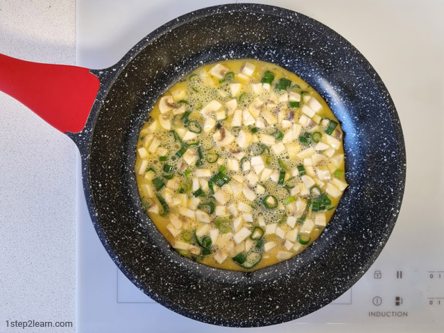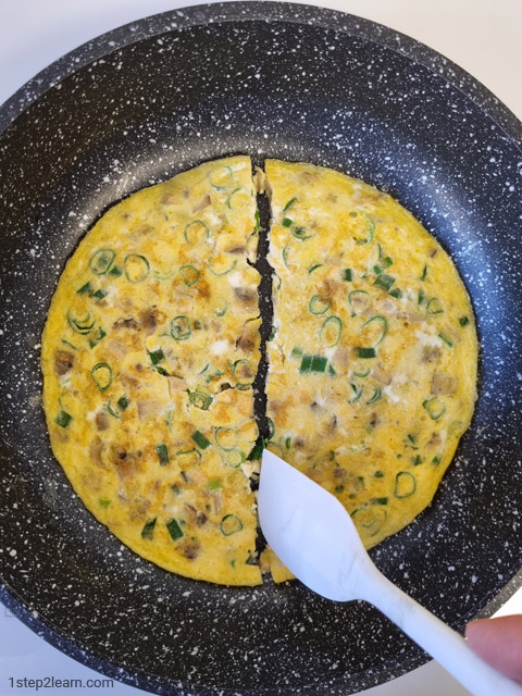 - שהחביתה (אומלט) מספיק קשיחה, הופכים צד ומטגנים כ-5 דקות על עוצמה יותר נמוכה.