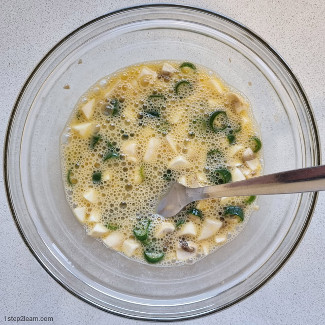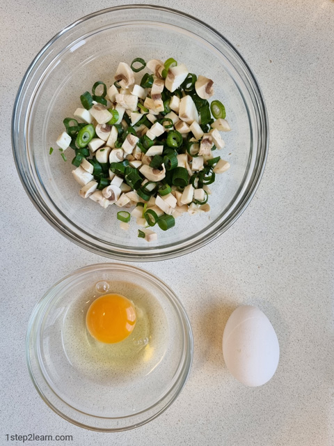 השלבים להכנת חביתה עם פטריות שמפיניון (תוספת הבסיס) ובצל ירוק (התוספת השנייה):