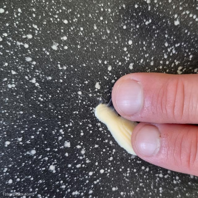 בעזרת שתי אצבעות אני מורח את החמאה על המחבת, אם זה אתה לא רוצה להתלכלך אפשר להשתמש בנייר סופג (אבל הוא יספוג חלק גדול). שים לב שאתה משמן את כל המחבת כולל השוליים, לפעמים שהופכים את החביתה היא נוגעת בצדדים אז קח את זה בחשבון.