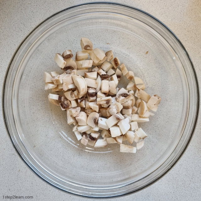 - שוטפים שתי פטריות שמפיניון בינוניות או אחת גדולה וקוצצים אותן לקוביות (תוספת הבסיס).