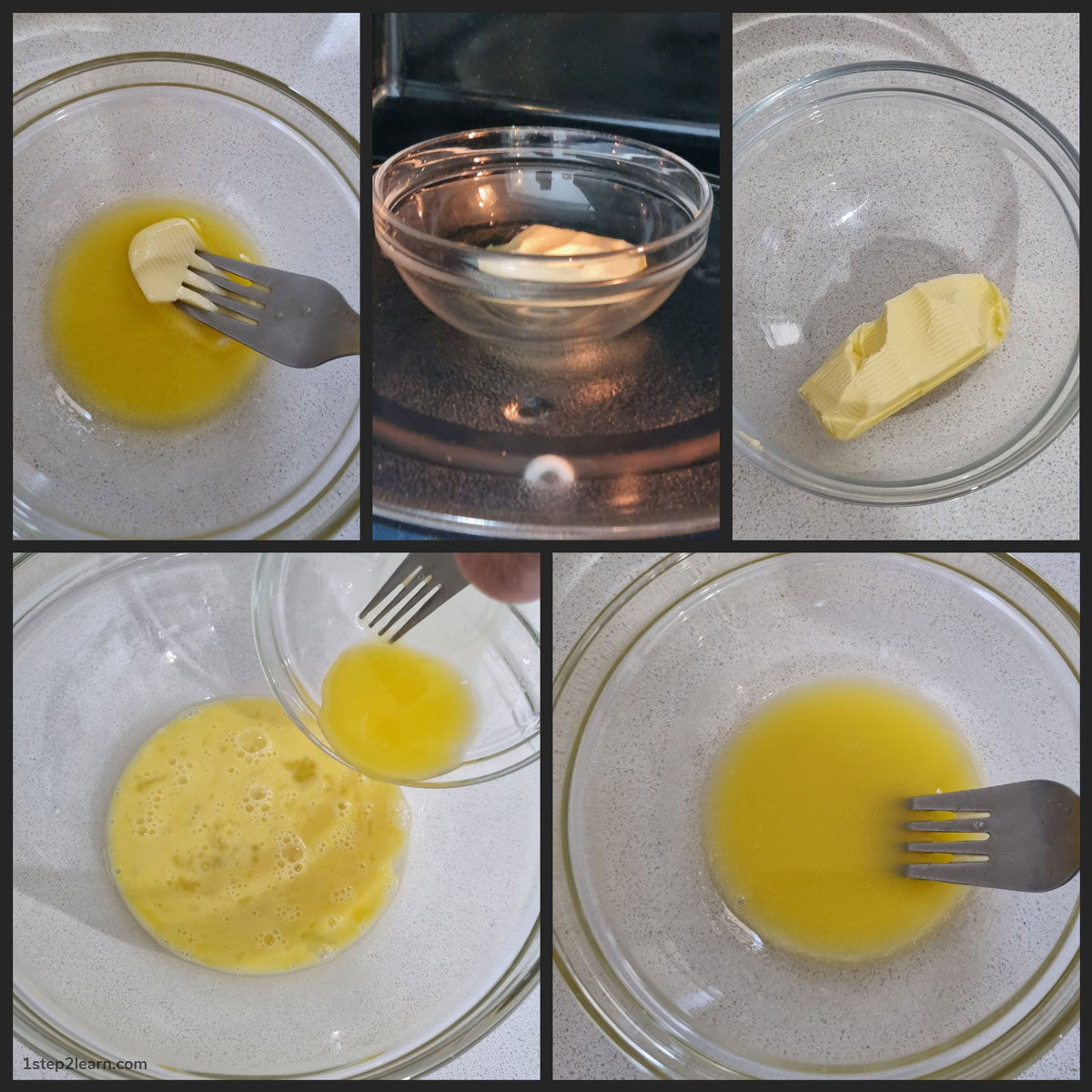 חשוב להמיס היטב את החמאה, תחמם אותה כ-30 שניות במיקרוגל, ערבב קצת עם המזלג אם זה לא הספיק אפשר לחמם שוב 10-20 שניות, רק חשוב לעקוב שאין פיצוץ לחמאה כי זה מלכלך את המיקרוגל. זכור שקערת הזכוכית חמה והחמאה תמשיך בתהליך ההמסה בזמן שאתה עובר לשלבים הבאים. מה שחשוב זה שתראה שאין גושים של חמאה, אם יש גושי חמאה ערבב שוב.