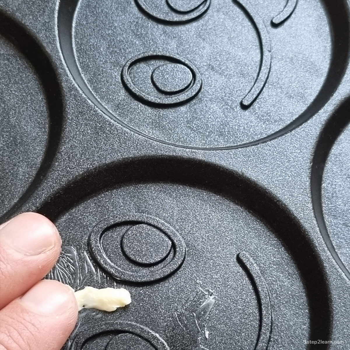 אחרי שאתה שם בקערה 40 גרם חמאה תשתמש באותו סכין ותחתוך חתיכה קטנה מהחמאה עבור המחבת. בעזרת שתי אצבעות שמן היטב את כל המחבת. השימון יספיק לכל הכנת 28 הפנקייקים, אין צורך לשמן שוב אחרי שמוציאים את הפנקייקים בכל סיבוב.