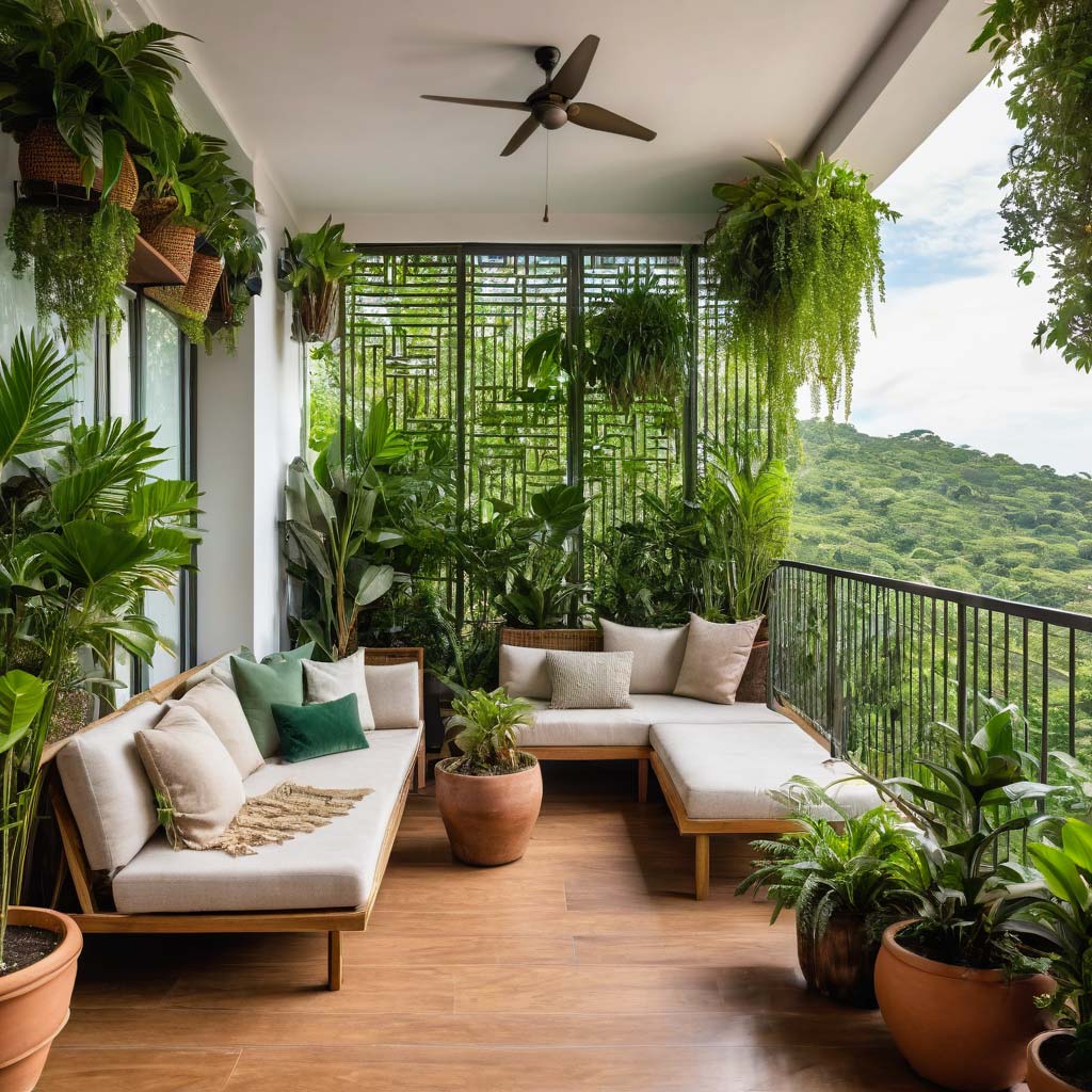 Comecei adicionando algumas árvores e arbustos ao longo das bordas da minha varanda. Não apenas elas ficam incríveis, mas também criam uma atmosfera aconchegante e isolada que é perfeita para relaxar.